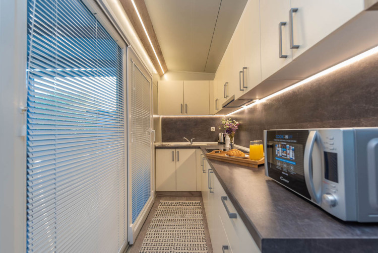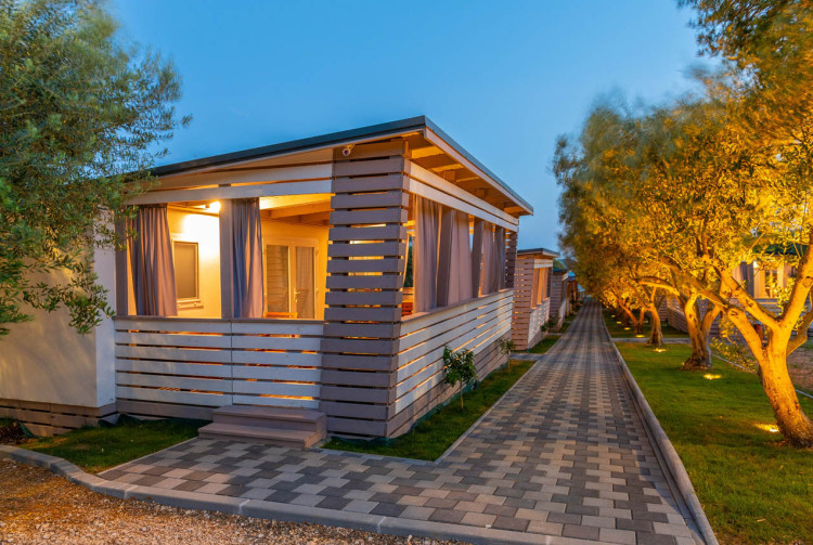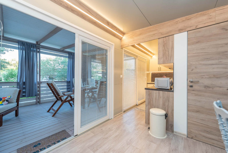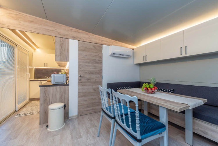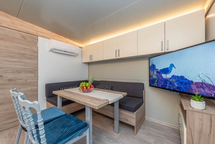 Exklusive Mobilheime haben 64 m2. Dazu gehören zwei Schlafzimmer, ein Doppelzimmer für zwei Personen und ein Schlafzimmer mit einem Doppelbett und einem Etagenbett für 3 Personen. Im Wohnzimmer können Eckmöbel als Zustellbett für noch zwei Personen genutzt werden. Mobilheime verfügt über ein großes Wohnzimmer, eine modern ausgestattete Küche und ein Bad mit Dusche. Im Wohnzimmer gibt es SAT-TV und Klimaanlage zum Heizen und Kühlen. Mobilheime sind mit Highspeed-Internet ausgestattet.