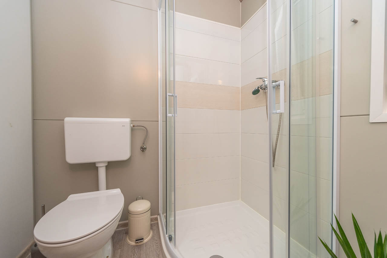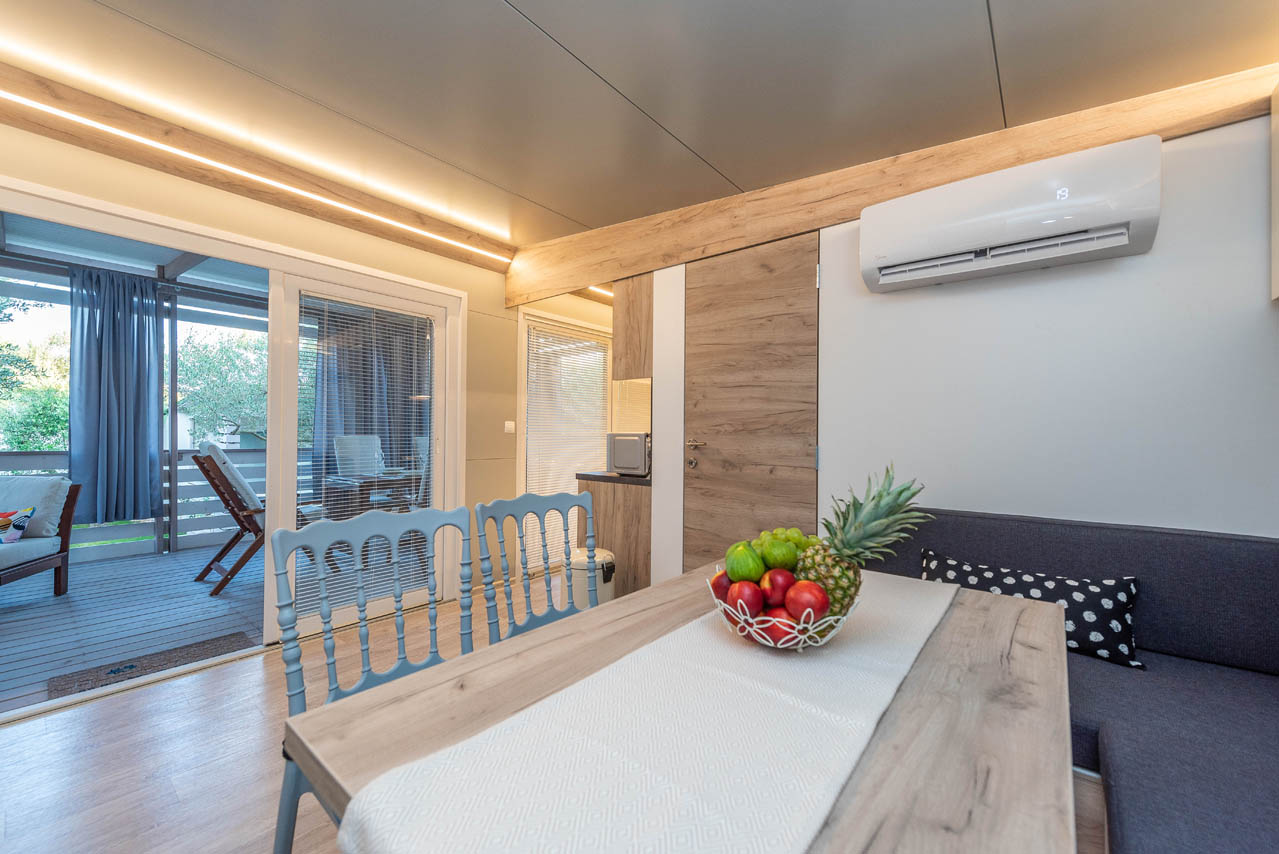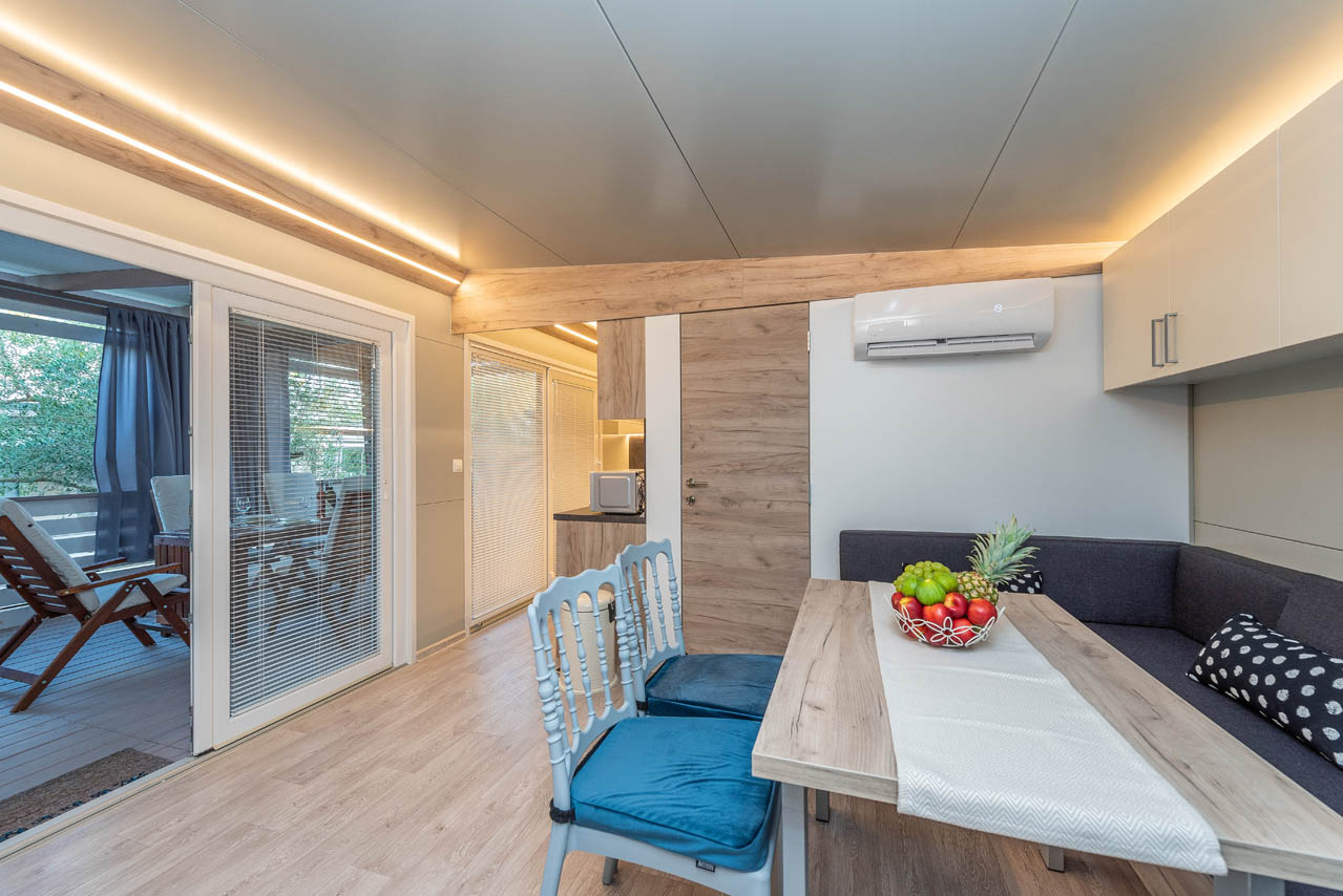 Exklusive Mobilheime haben 64 m2. Dazu gehören zwei Schlafzimmer, ein Doppelzimmer für zwei Personen und ein Schlafzimmer mit einem Doppelbett und einem Etagenbett für 3 Personen. Im Wohnzimmer können Eckmöbel als Zustellbett für noch zwei Personen genutzt werden. Mobilheime verfügt über ein großes Wohnzimmer, eine modern ausgestattete Küche und ein Bad mit Dusche. Im Wohnzimmer gibt es SAT-TV und Klimaanlage zum Heizen und Kühlen. Mobilheime sind mit Highspeed-Internet ausgestattet.