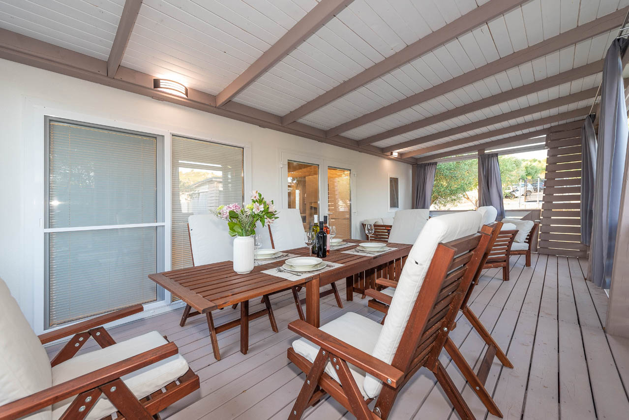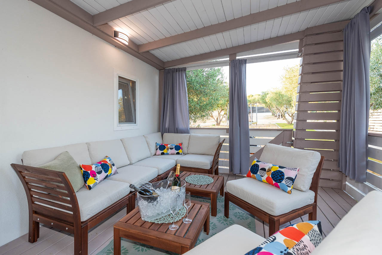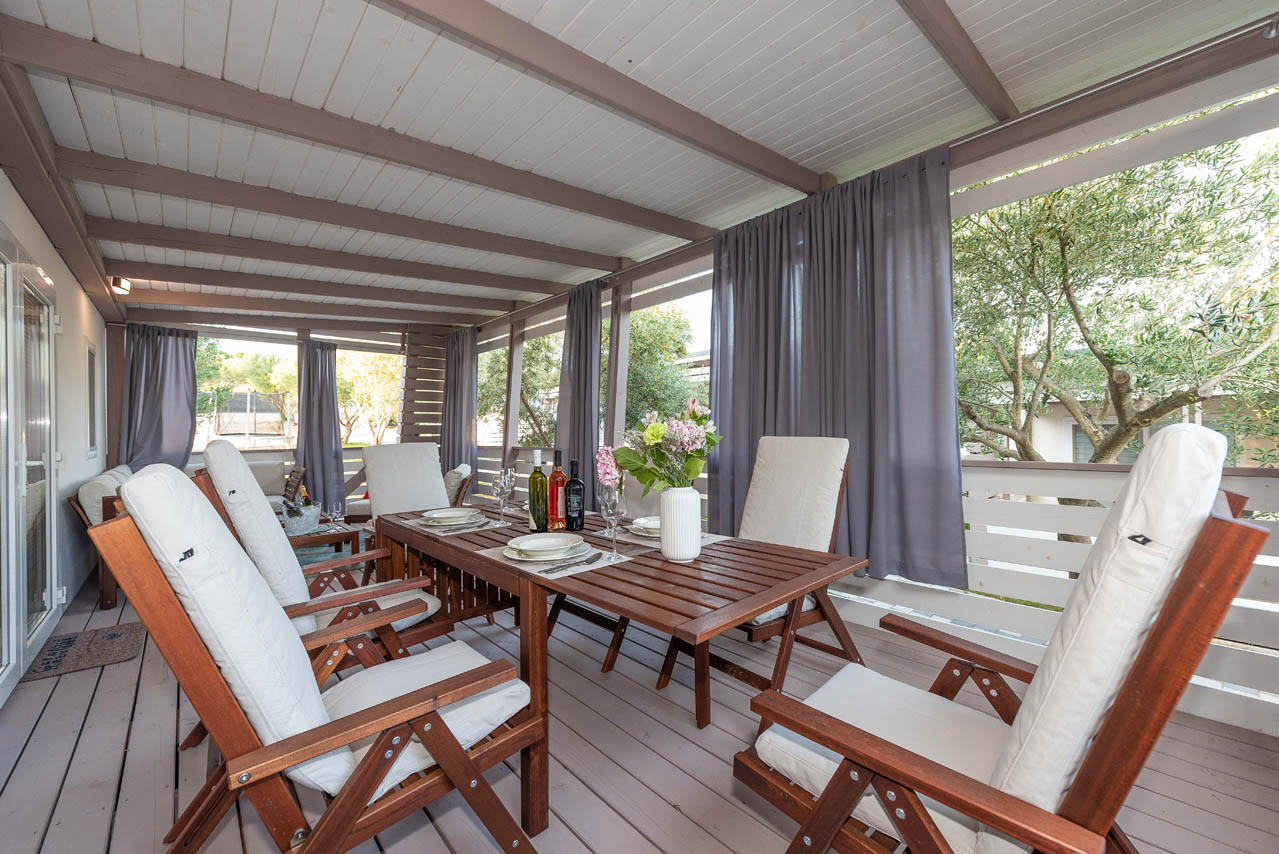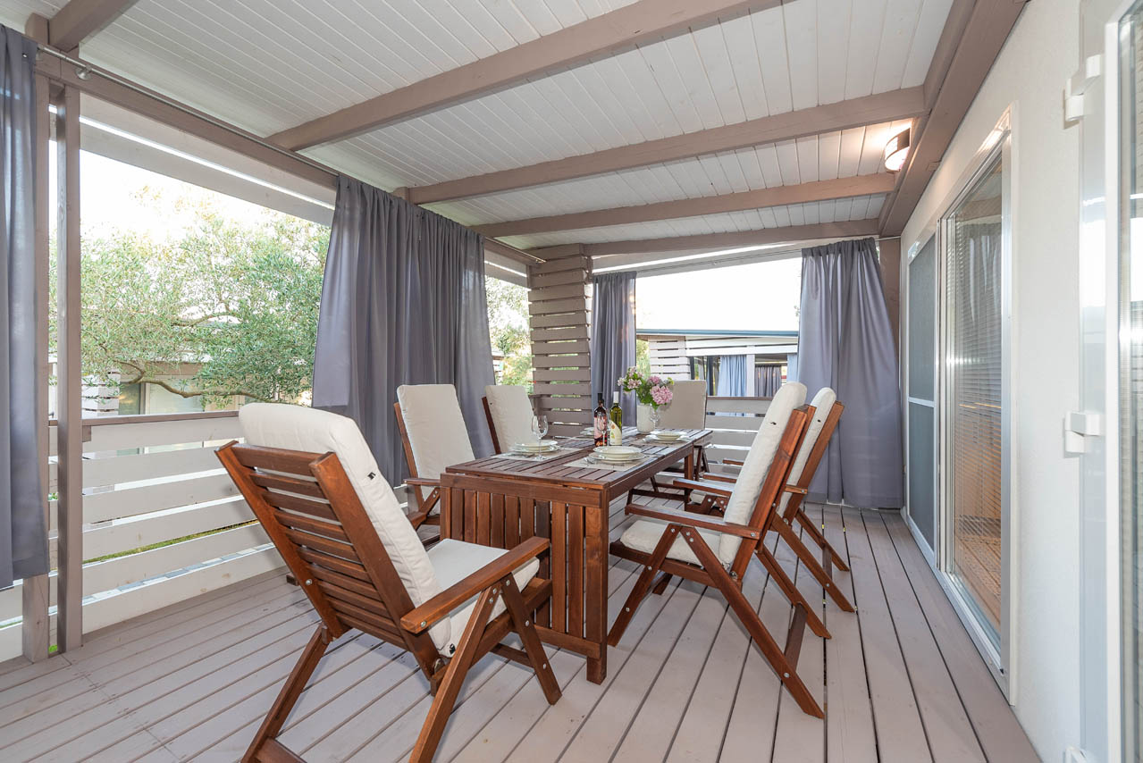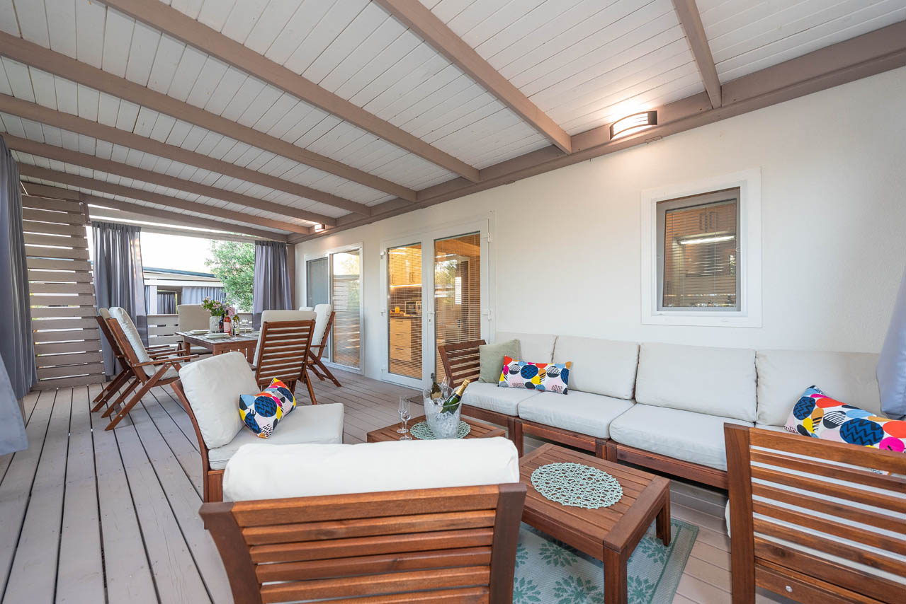 Die private Außenterrasse des Mobilheims bietet Meerblick und ist geräumig und komfortabel. In einer Ecke gibt es einen Loungebereich und noch einen Gartentisch für 7 Personen. Die Terrasse ist für einen angenehmen und ruhigen Aufenthalt Ihrer Kinder oder Haustiere geschlossen.