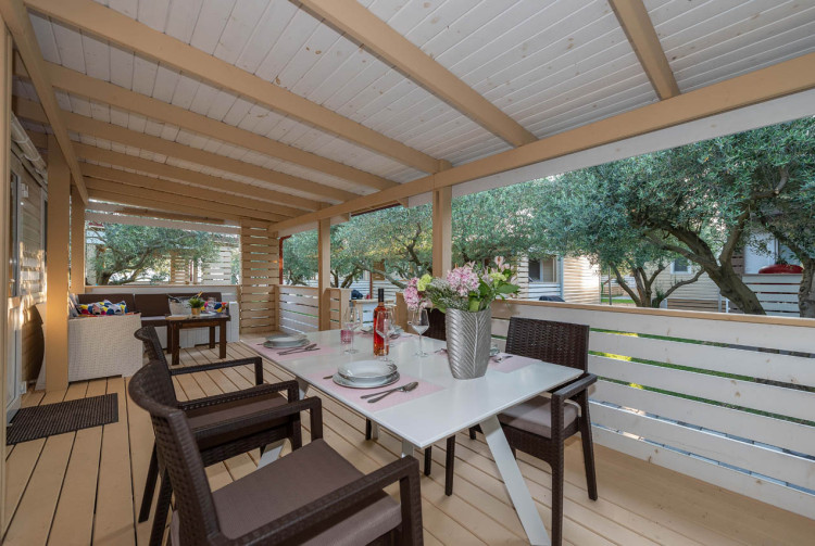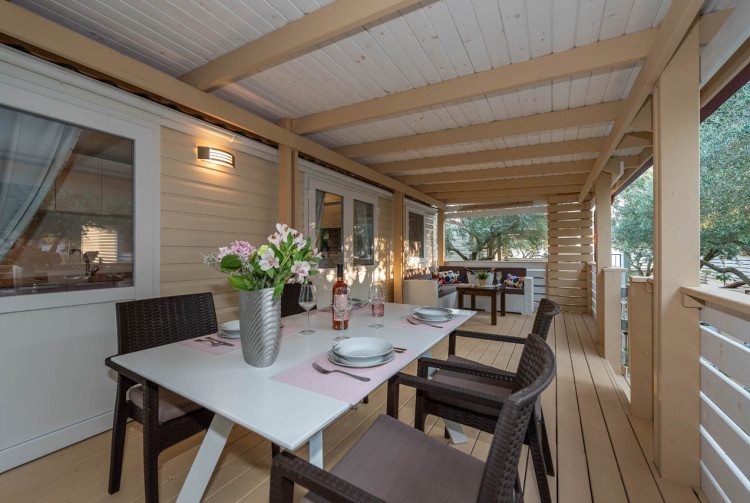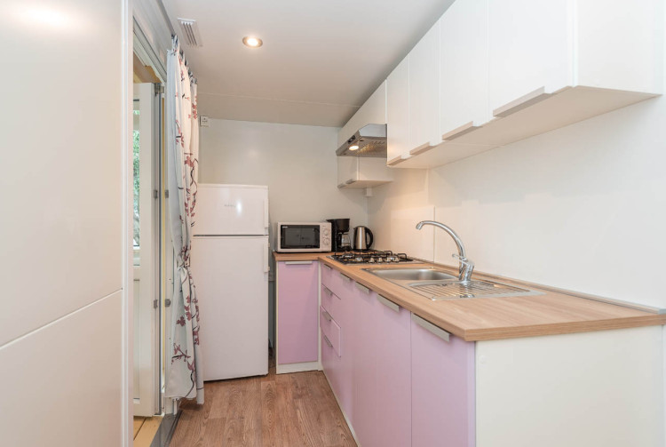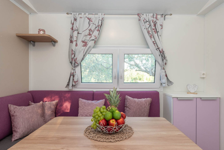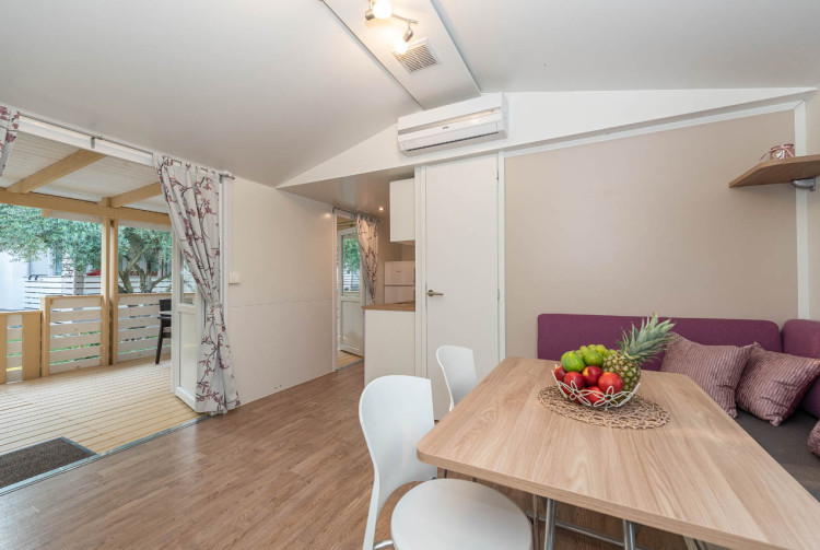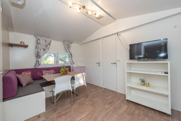 Mobilheime ADRIA haben 54 m2. Sie verfügen über zwei Schlafzimmer, ein Doppelzimmer und ein separates Zimmer mit zwei Einzelbetten. Im Wohnzimmer befindet sich eine Sitzecke, die als Zustellbett für noch zwei Personen genutzt werden kann. Mobilheime ist geräumig und verfügt über ein großes Wohnzimmer, eine modern ausgestattete Küche und ein Bad mit Dusche. Das Haus ist mit SAT-TV, Klimaanlage zum Heizen und Kühlen und Highspeed-Internet ausgestattet.